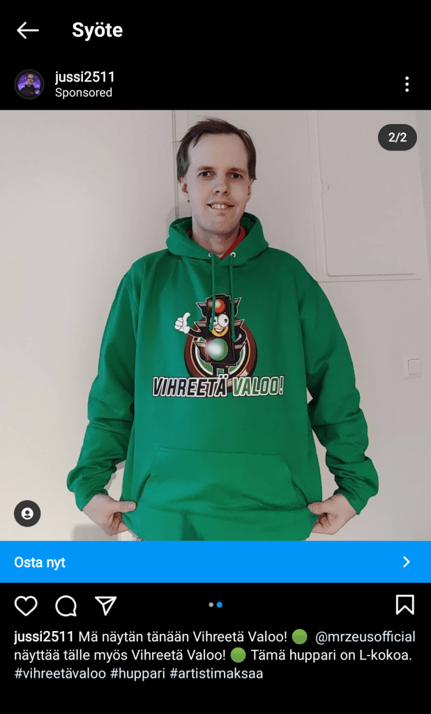 Vihreetä Valoo -huppari saapui mulle sopivasti huhtikuun 1. päivänä. Tämä ei ollut kuitenkaan aprillia. 🙂 Huppari on L-kokoa, vaikka mulle menee sopivasti myös M-koko. Tykkään pitää myös isompia huppareita, koska näiden kahden koon välillä on vain lähinnä pystysuuntainen pituusero.