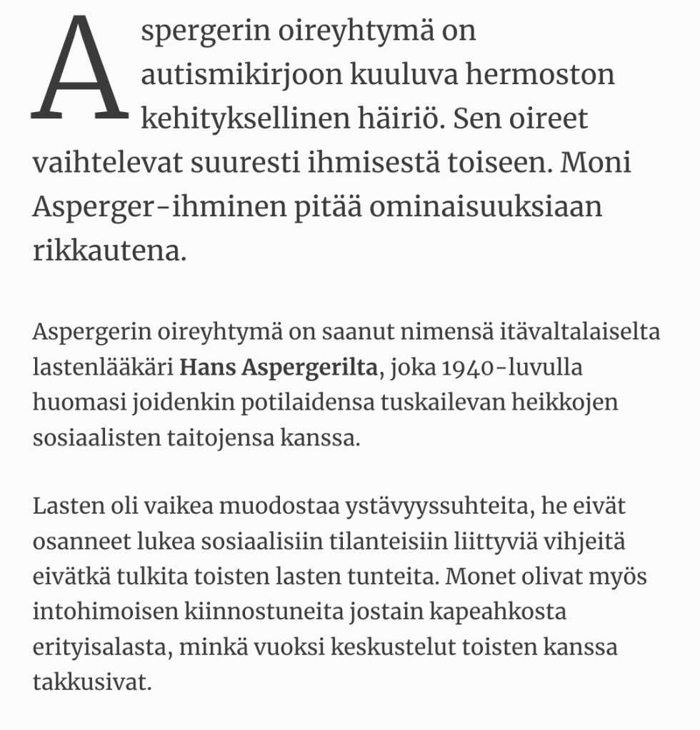 Aspergerin-oireyhtymää ei nykyään enää ole itsenäisenä vaan se luokitellaan Autisminkirjon häiriöihin kuuluvaksi. Kyseessä on siis lievä muoto, mutta erilaiset piirteet ja rajoitteet ovat yksilöllisiä.