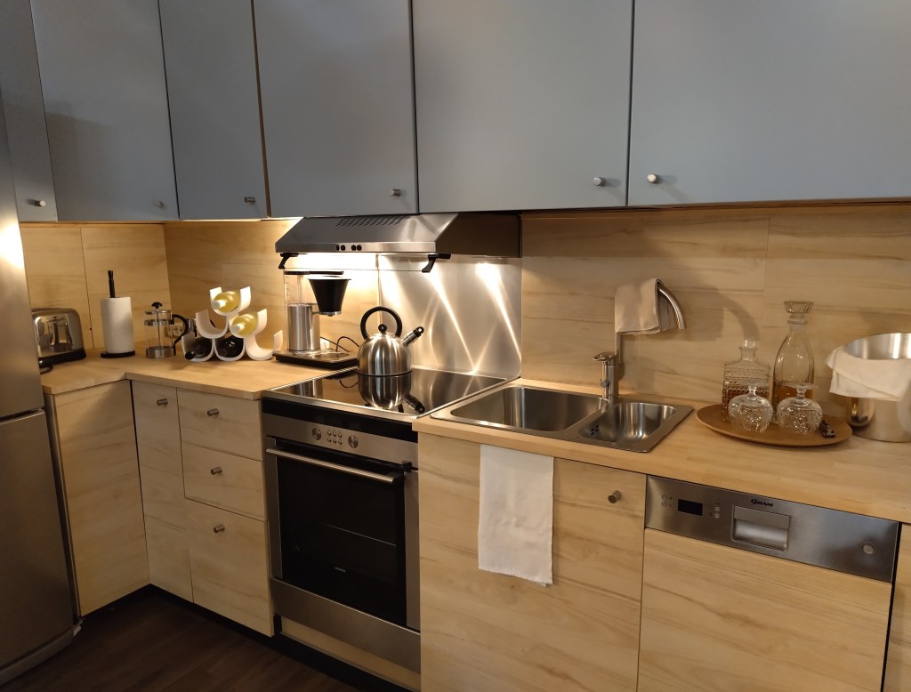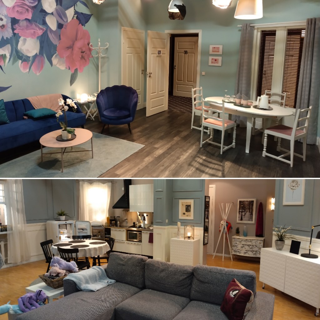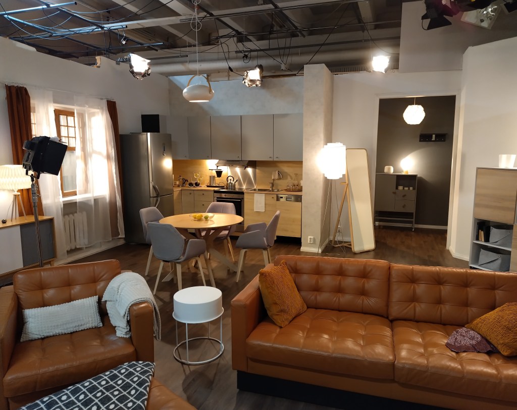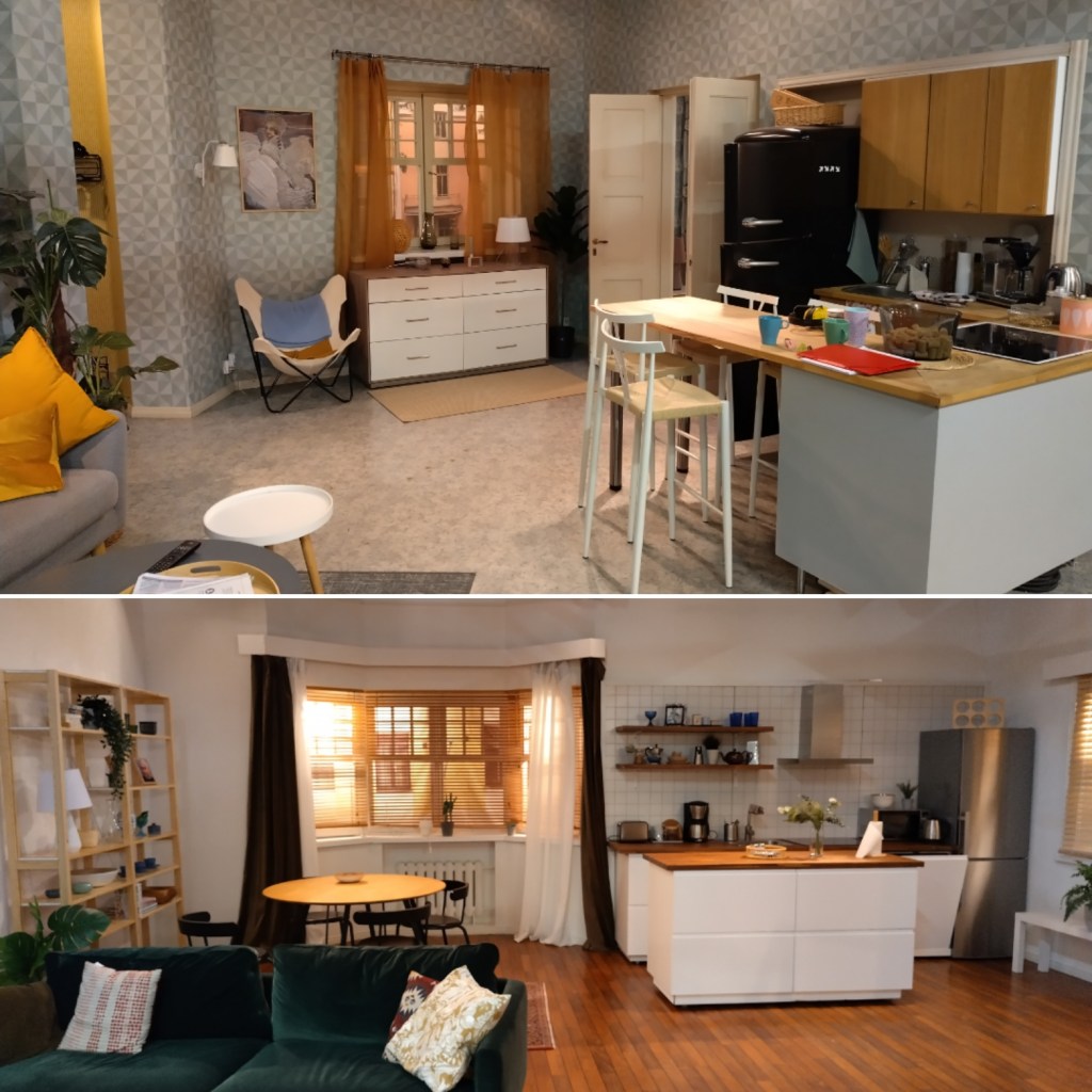 Kodinkoneiden toimivuutta en lähtenyt testaamaan, mutta aidoilta näyttivät. Tietty pitääkin olla uskottavan oloisia, kun lavasteet esittävät näyttelijöiden koteja. Oikeita maisemia ei tietenkään voinut lavasteikkunoista nähdä vaan kankaille painettuja taustoja.