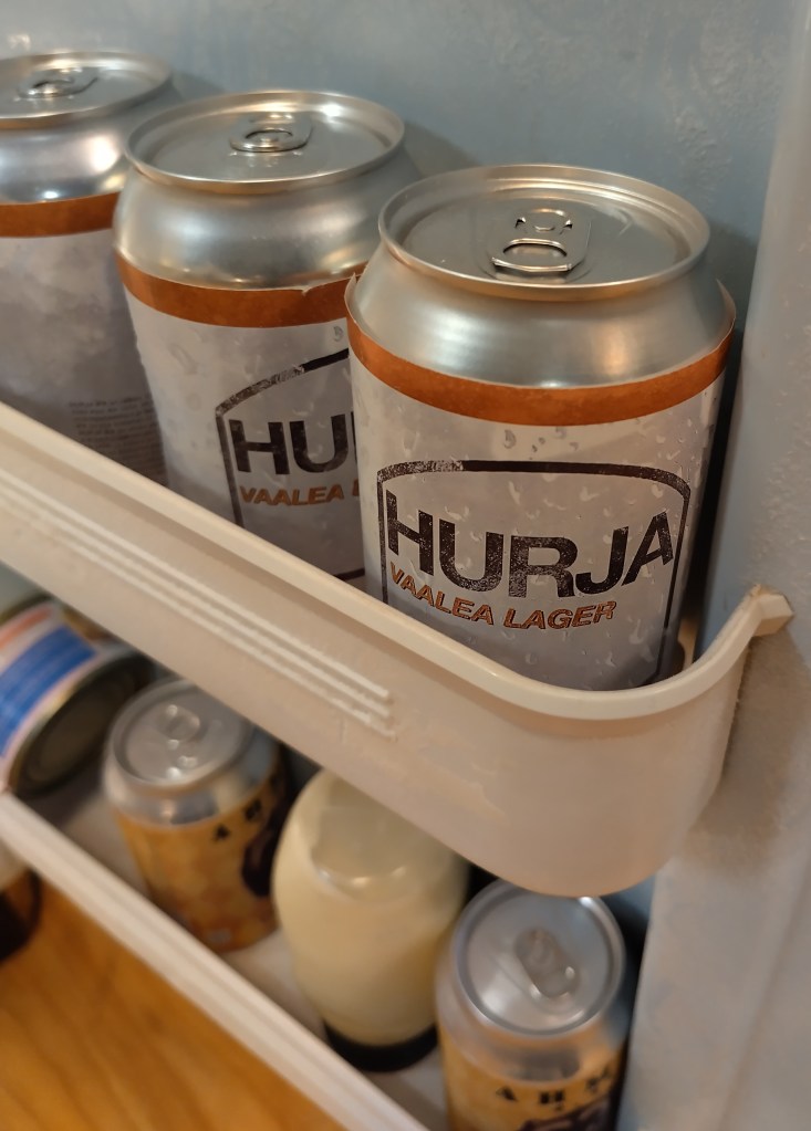 Avaamattomissa tölkeissä havaitsin olevan oikeasti jotain juomaa. Mitäköhän ovat niihin purkittaneet? Keksittyjä tuotemerkkejä löytyi yllin kyllin lavasteista, mutta ihan aitojakin oli joukossa.