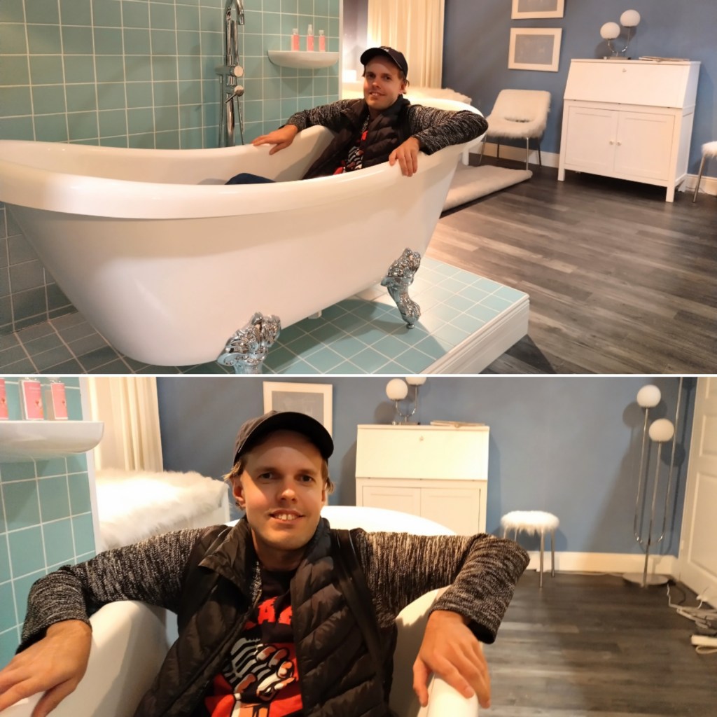Palataan vielä kuvauksiin. Niitä tehdään studiolla kahden kameran voimin. Aiemmin käytettiin monikameratekniikkaa. Ulkokuvauksia on tehty alusta alkaen yhdellä kameralla. Ja kuvauspaikkoja on ollut aikojen kuluessa lukuisia. Niissä emme käyneet. Ja pitkä matka tulisi, jos lähtisimme esimerkiksi Kanarian saarille saakka! Ehkä pysyttelemme kuitenkin studiolla ja siirrymme tästä eteenpäin, tai oikeastaan uppoudumme erityisesti lavastuksen maailmaan. Mulle kävi ainakin niin hyvin perusteellisesti, sillä olin ammeen pohjallakin!