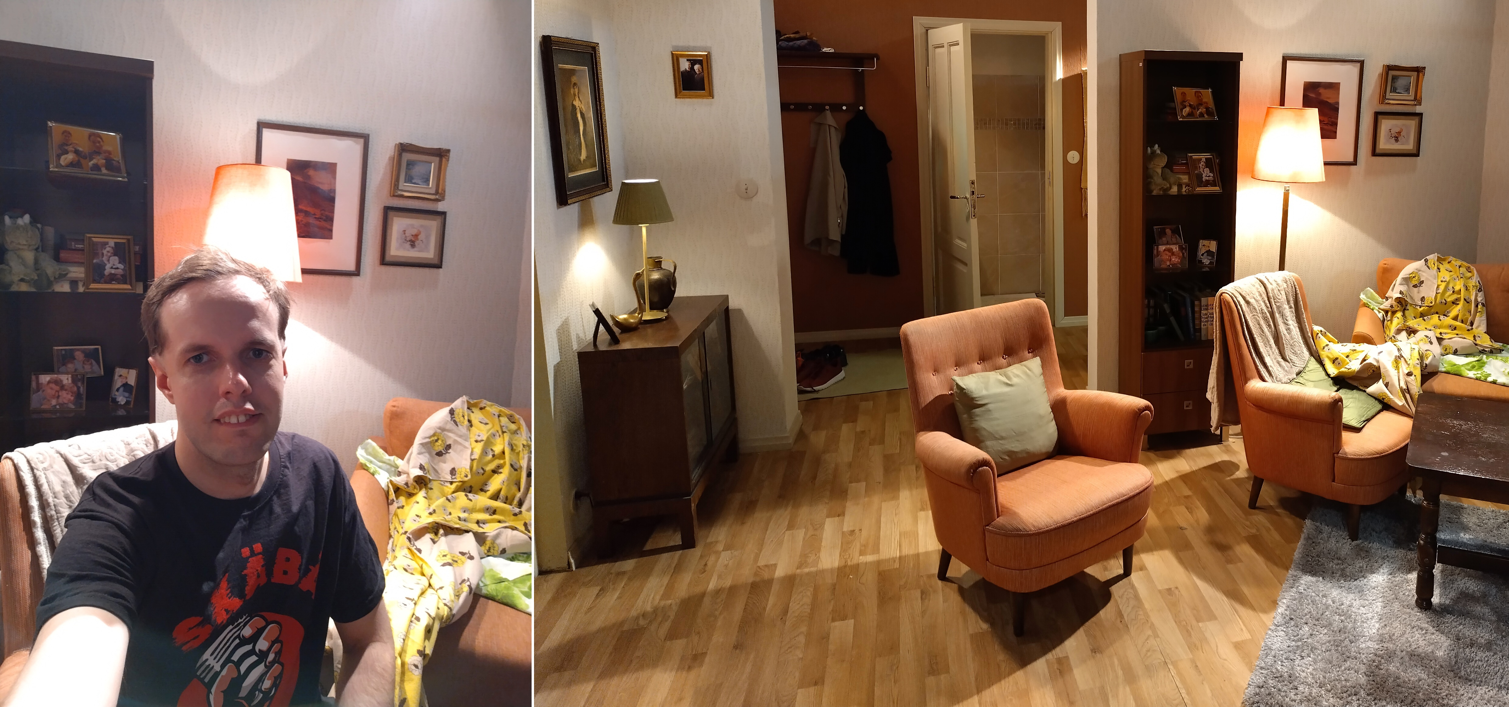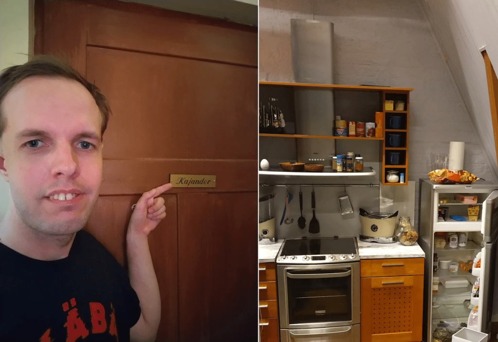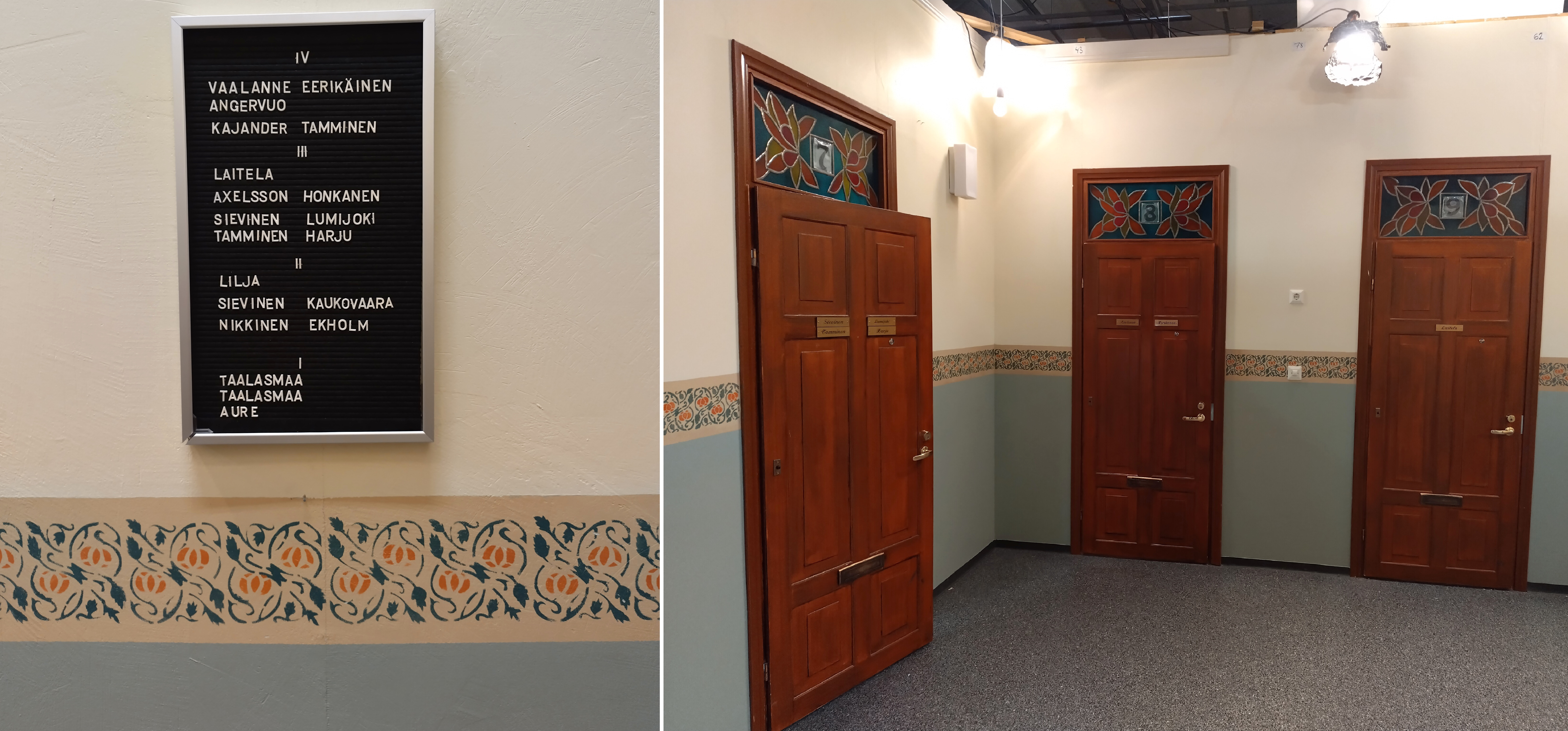 Vaikka näissä kuvissa (ja TV:ssäkin) näyttää siltä, että ulko-ovesta mentäisiin suoraan asuntoon, niin todellisuudessa näin ei ole. Oven toisella puolella on vain tyhjä käytävä. Asuntojen lavasteet sijaitsevat muualla. Asuntojen ovista on tehty näkymä puolestaan niin, että sieltä pääsisi rappukäytävään. Porrastasannekaan ei johda loogisesti mihinkään eli se loppuu lyhyeen. Hissin liike saadaan aikaan liikuttamalla vanerilevyä.